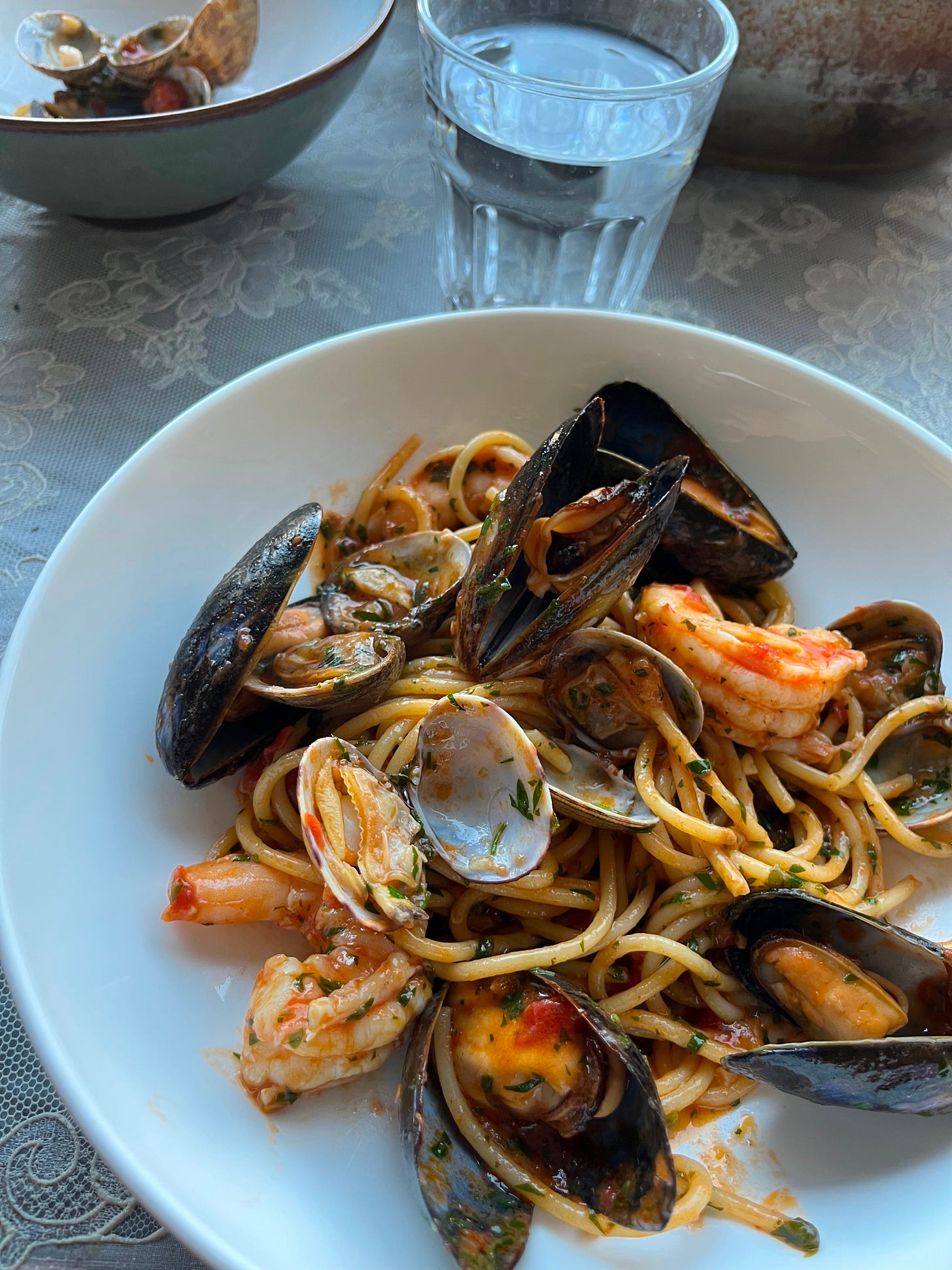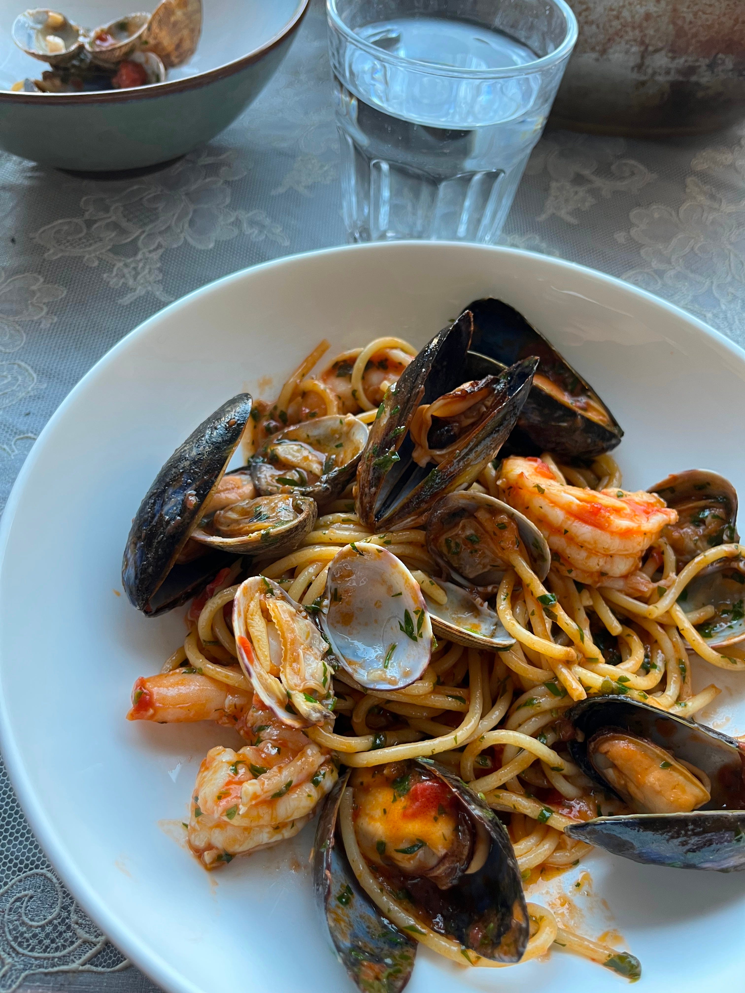 We’ve picked the colour for the exterior awning, a beautiful deep rust. Holding it up to the tiles outside, the combination of colours looked so similar to Maria Pia’s. Pulls on the finest of heartstrings, but that’s a story for another time. I wish my mum could see it.I’ve started testing some dishes too. At home I made spaghetti ai frutti di mare, with mussels clams and prawns. They seafood will be at its peak when we open in winter, even though everyone thinks it’s a summer dish. I was thinking about a sharing size, made for two guests, which comes to the table on a large dish with a nice big serving spoon. Finger bowls with lemon and glistening ice buckets with bottles of Verdicchio inside.