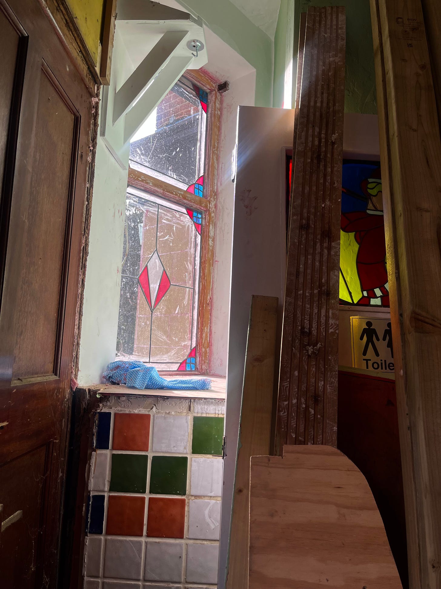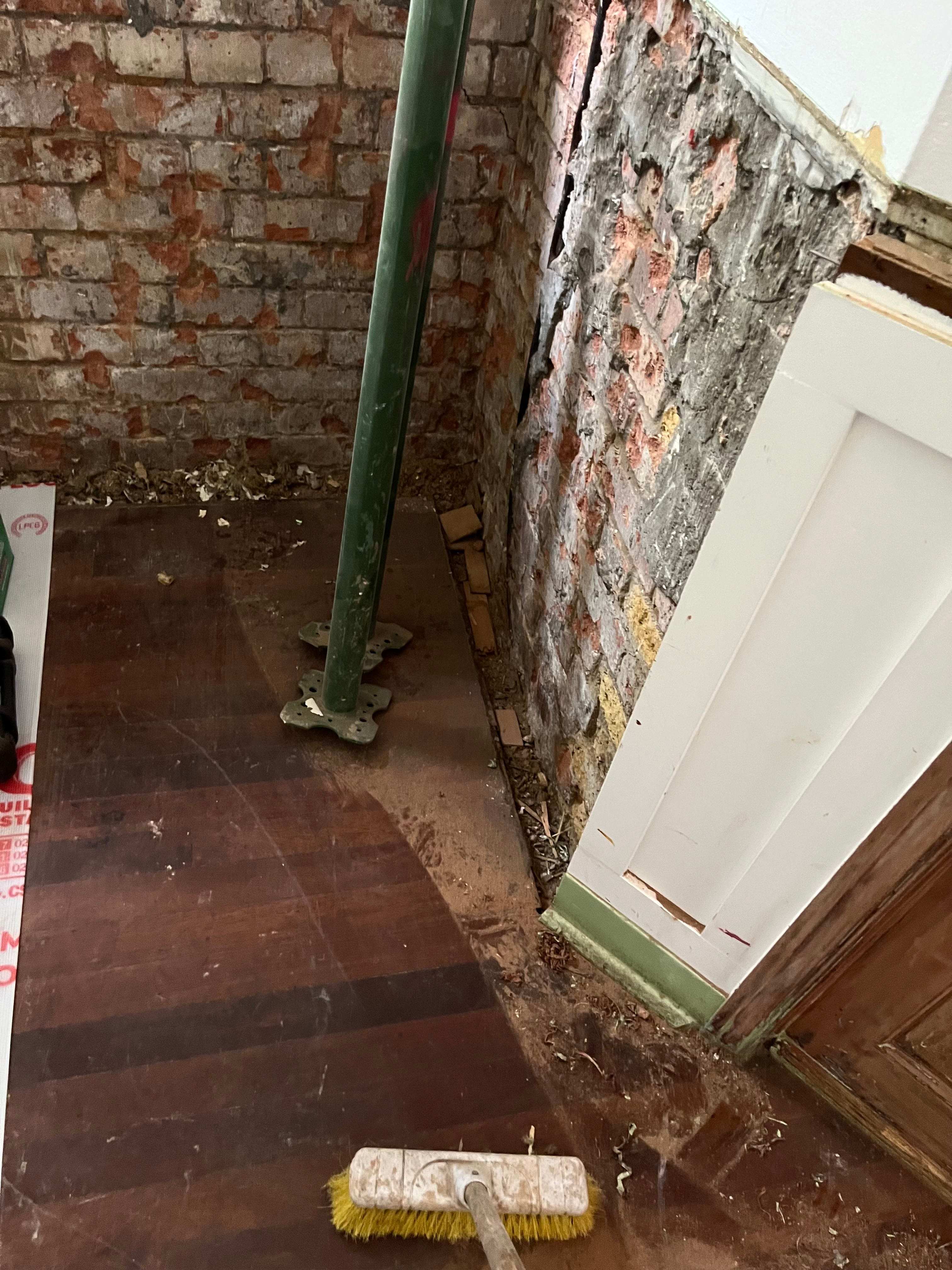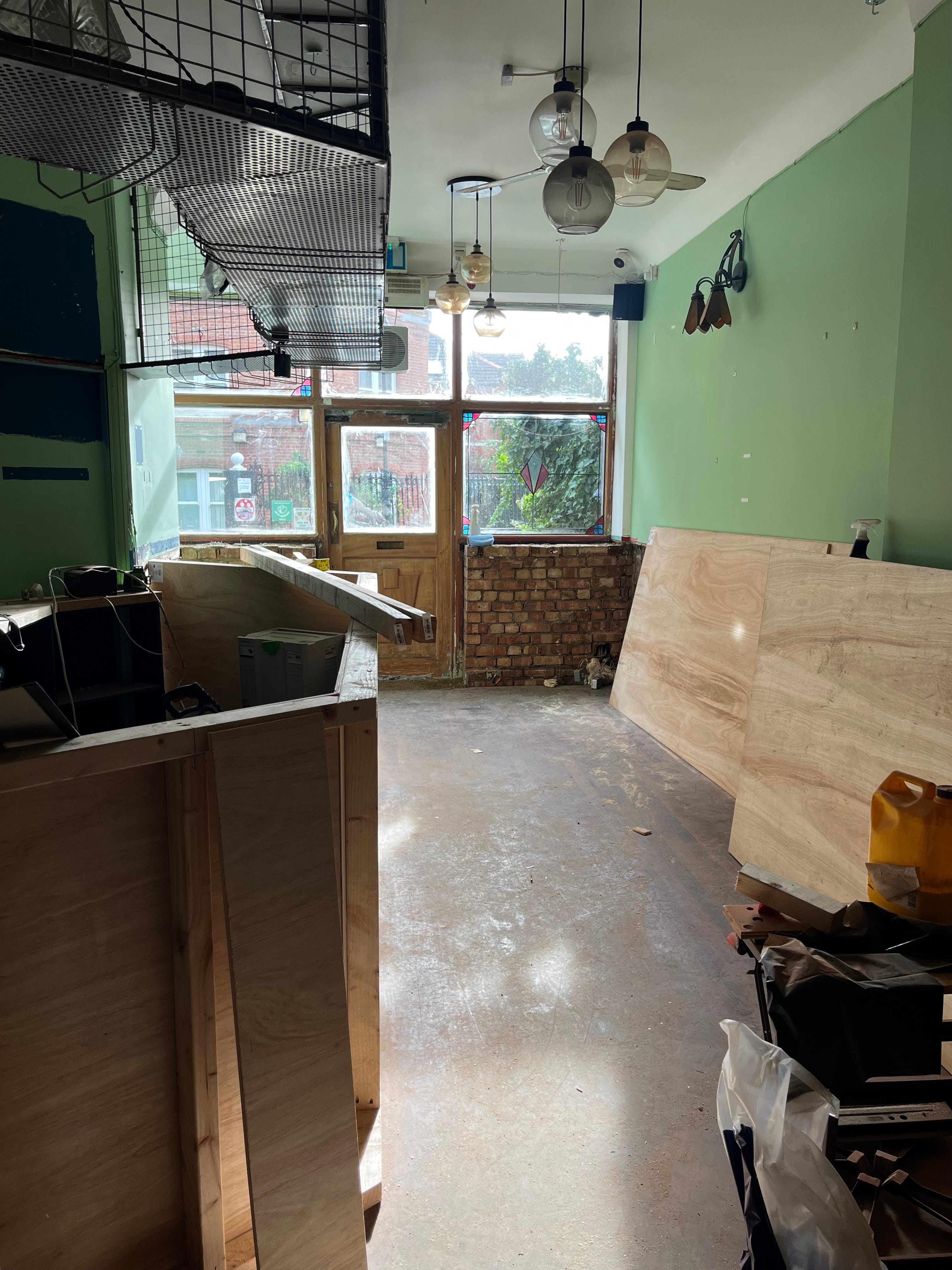 So much has happened in two weeks. Almost all of the mint green paint is gone from the outside, the steel beam that got put in place instead of the wall is all boxed in, and we have the foundation of a bar. Even though it’s now November, the light that hits the bar and dining room around midday is incredible. It seems to dance around the leftover dust from the brick removal work, and even though we’re still so far off I can start picturing a stream of guests huddling around the end, drinking Fernet Branca and half pints of lager.